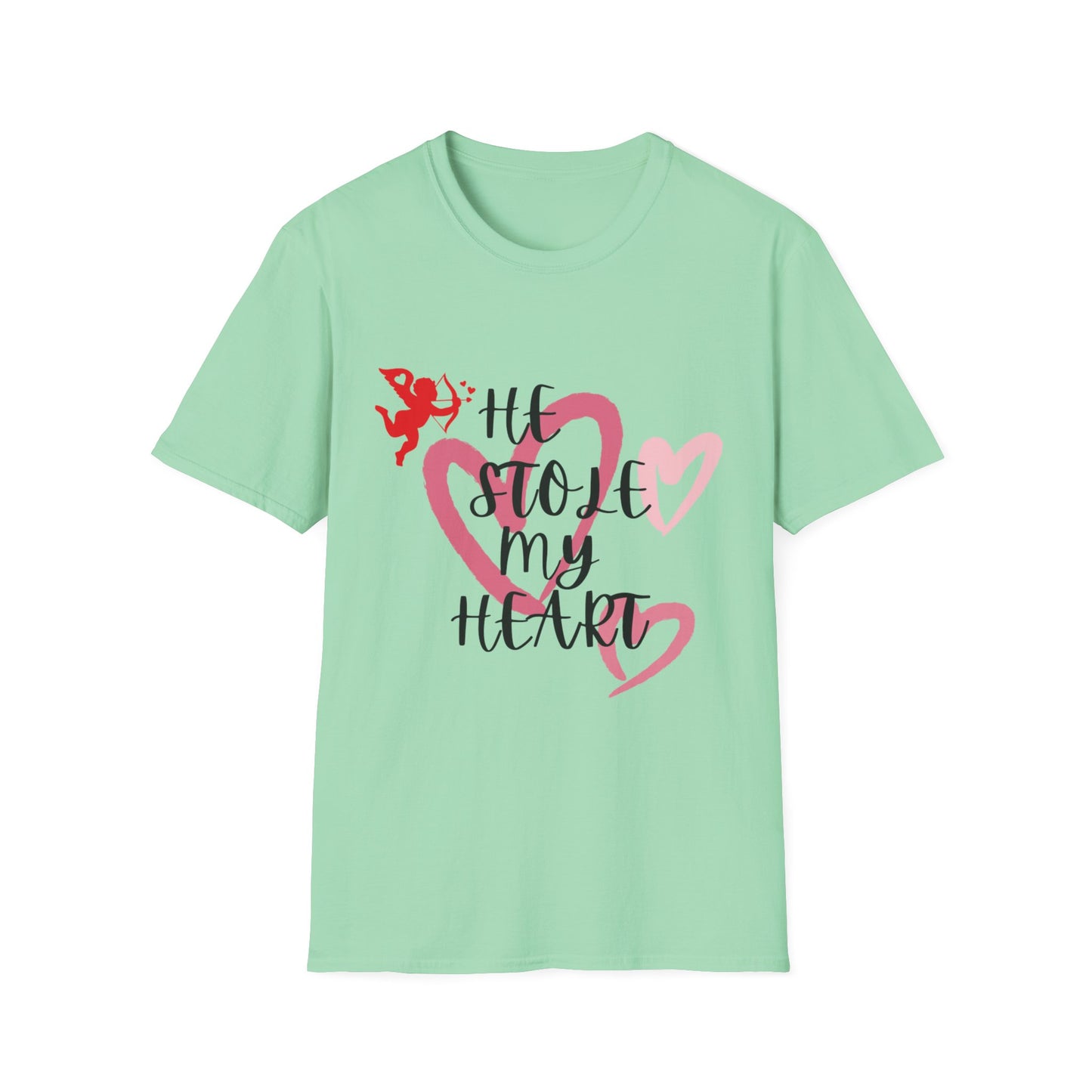 He Stole My Heart T-Shirt - Cute Valentine’s Day Couple Shirt. This unisex softstyle T-shirt is made from 100% ring-spun cotton, offering a lightweight and comfortable fabric. The classic fit and crew neckline make it versatile for any occasion, whether formal or semi-formal. Perfect for adults looking for a cute Valentine's Day outfit.