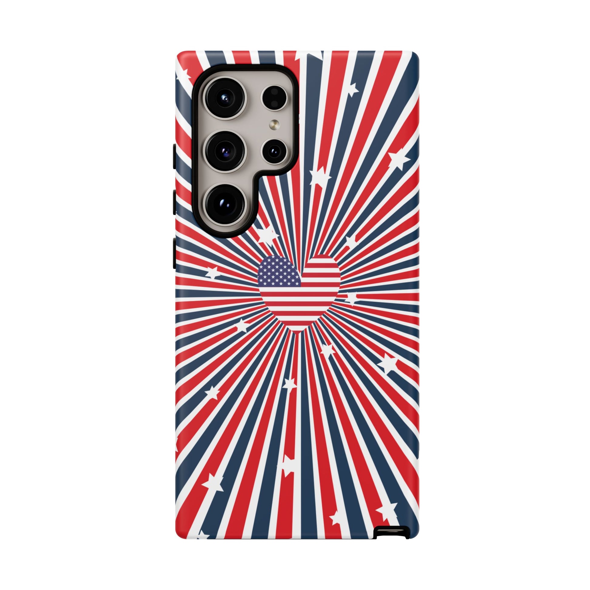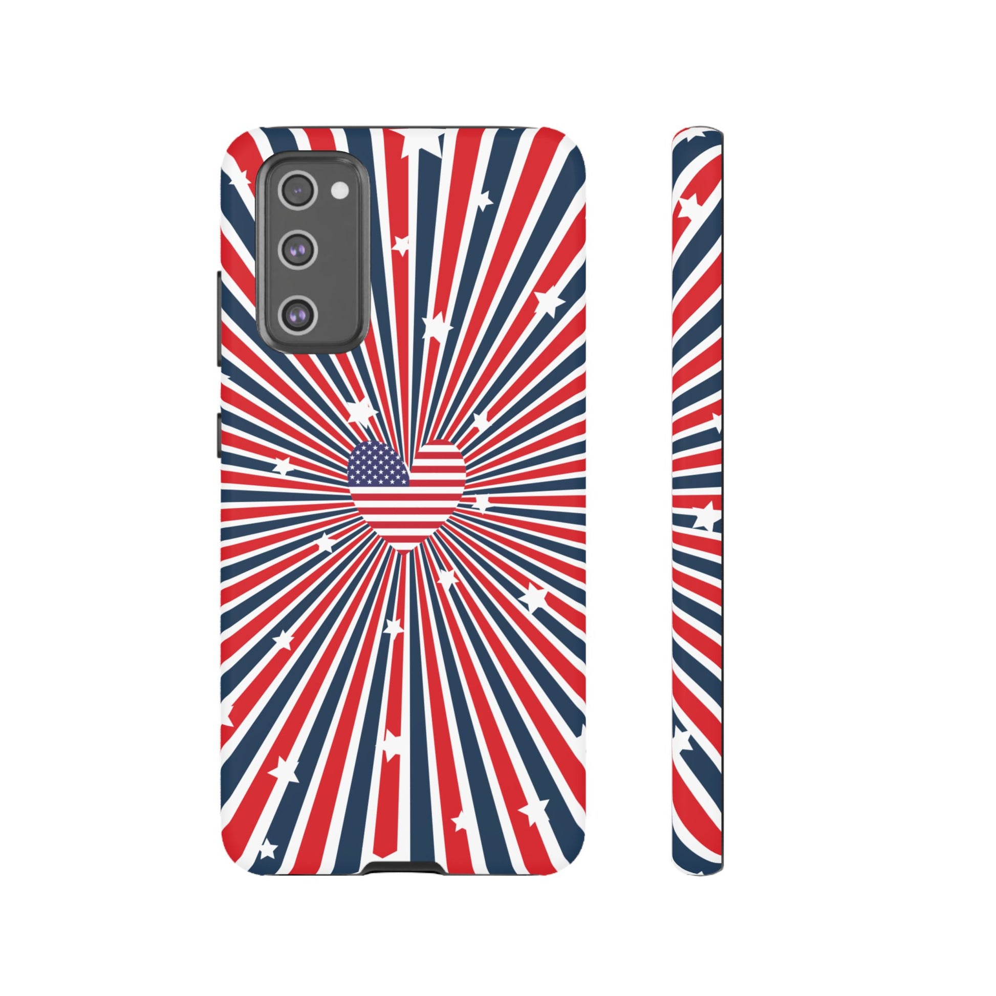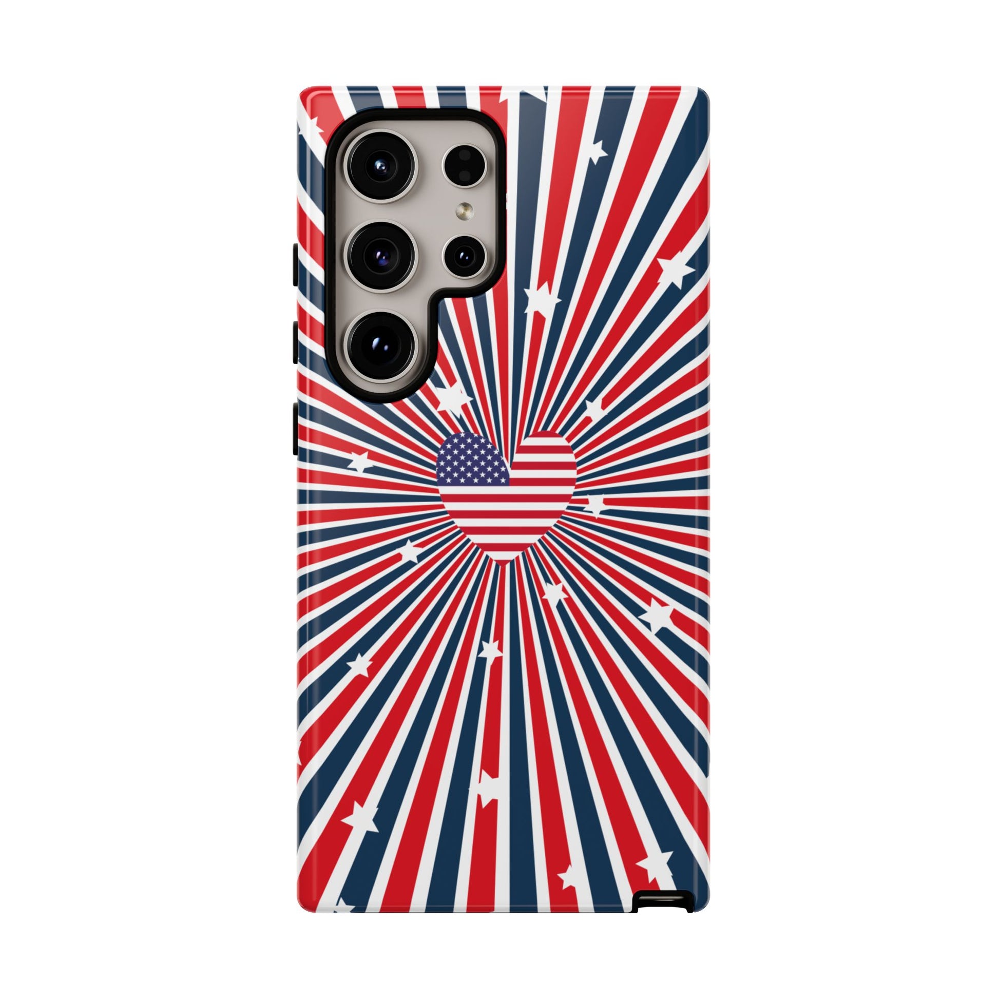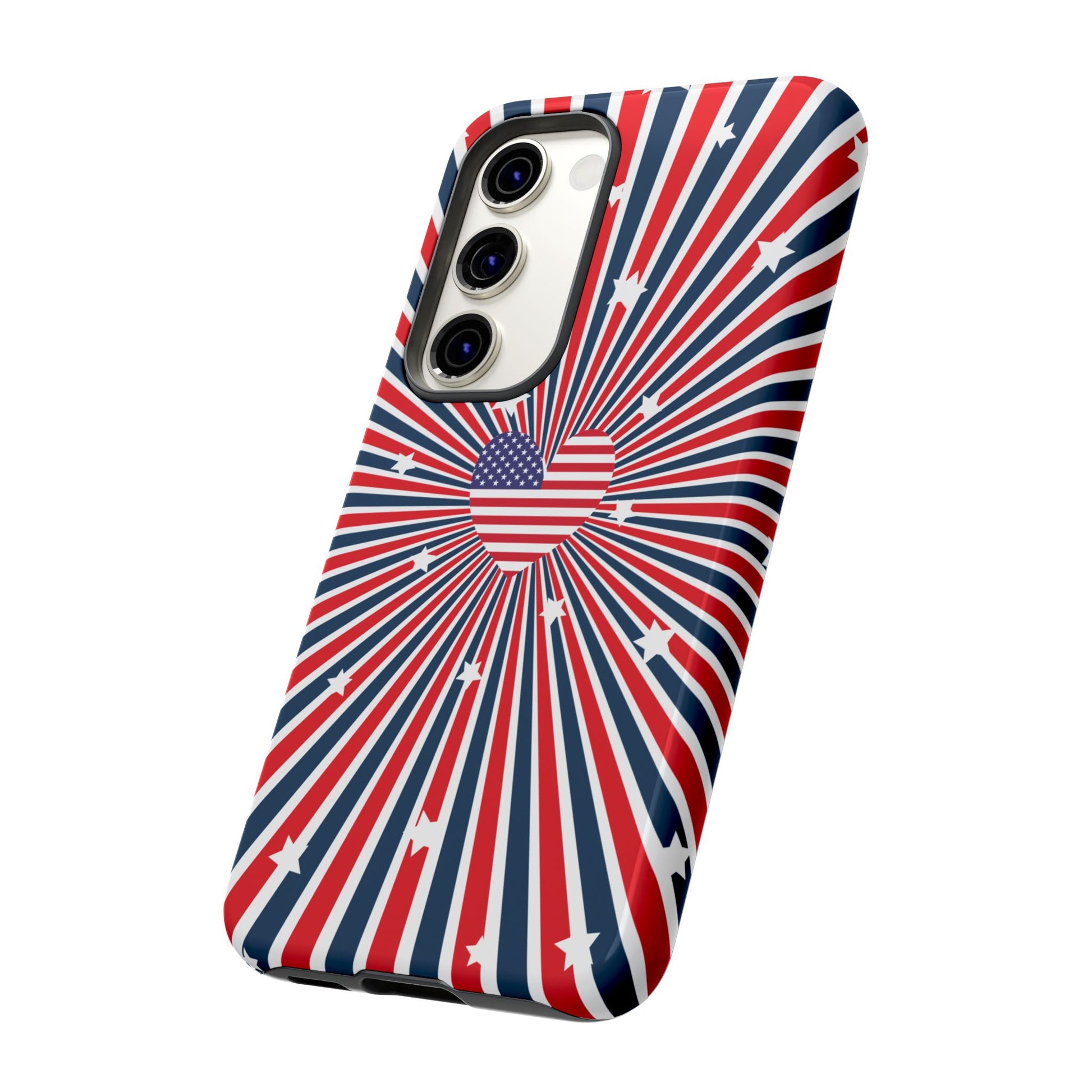 Patriotic Tough Phone Case perfect for 4th of July, Memorial Day, and Independence Day celebrations. Made with Lexan plastic and a flexible rubber liner for ultimate protection. Features a glossy finish and UV protection for long-lasting durability. Ideal for those who want to show their American pride while keeping their phone safe.