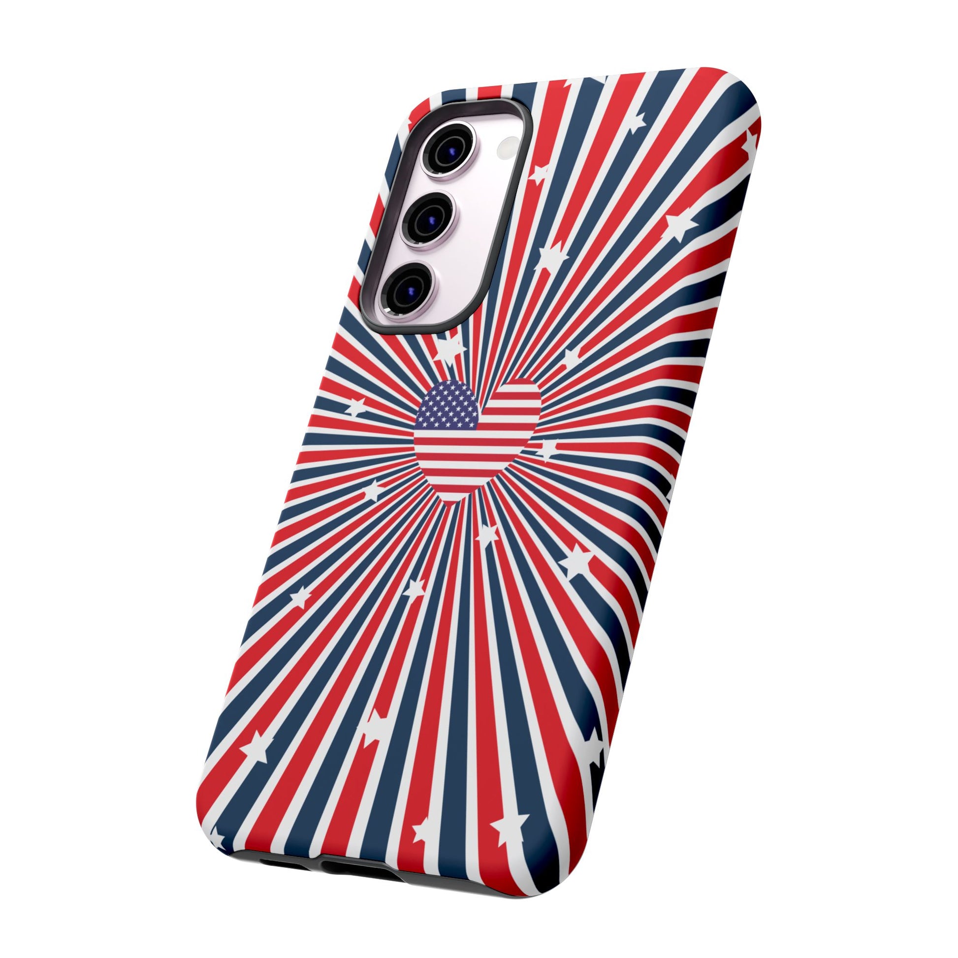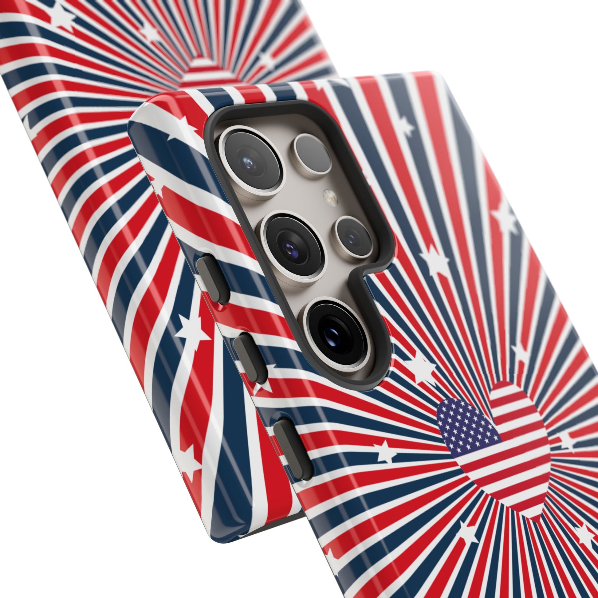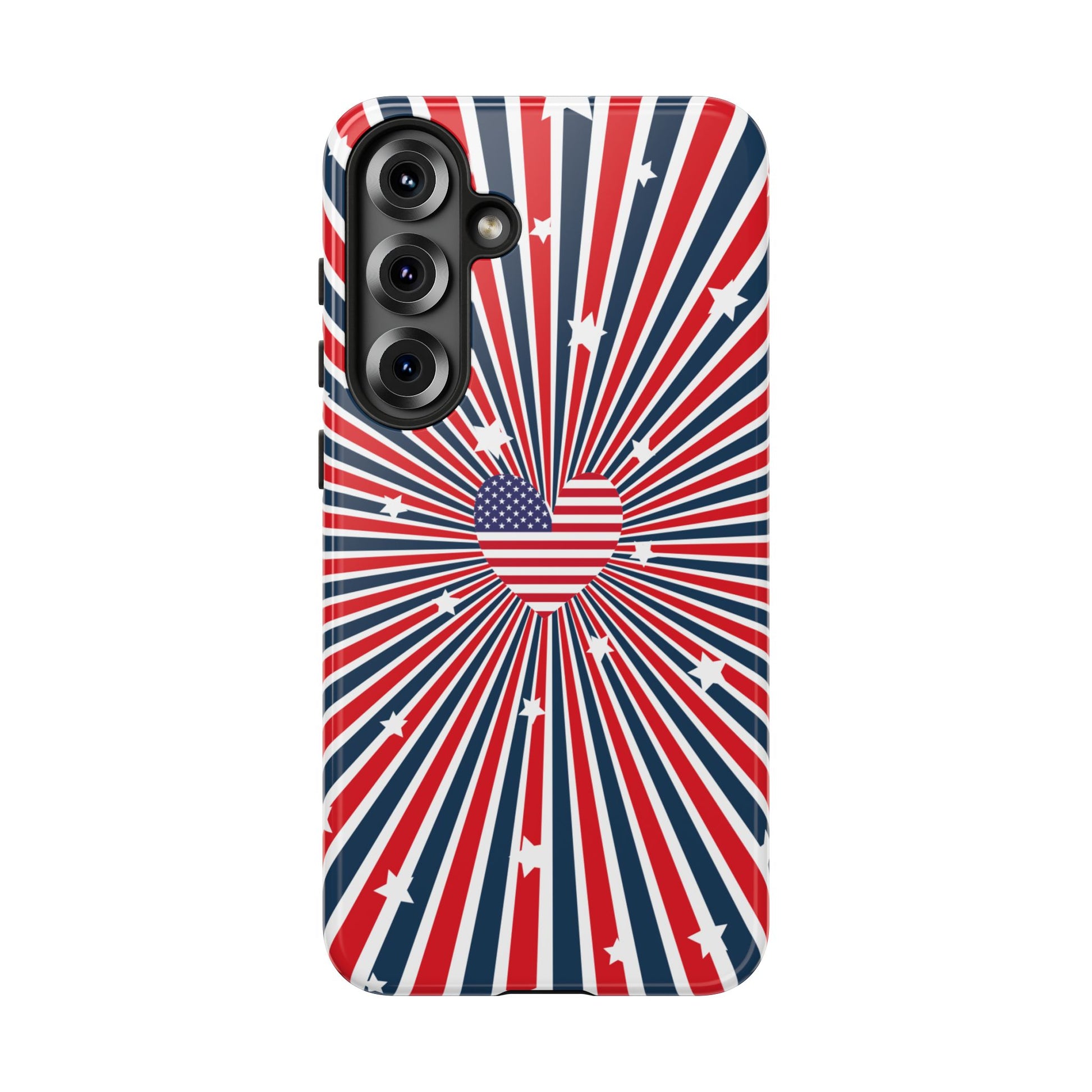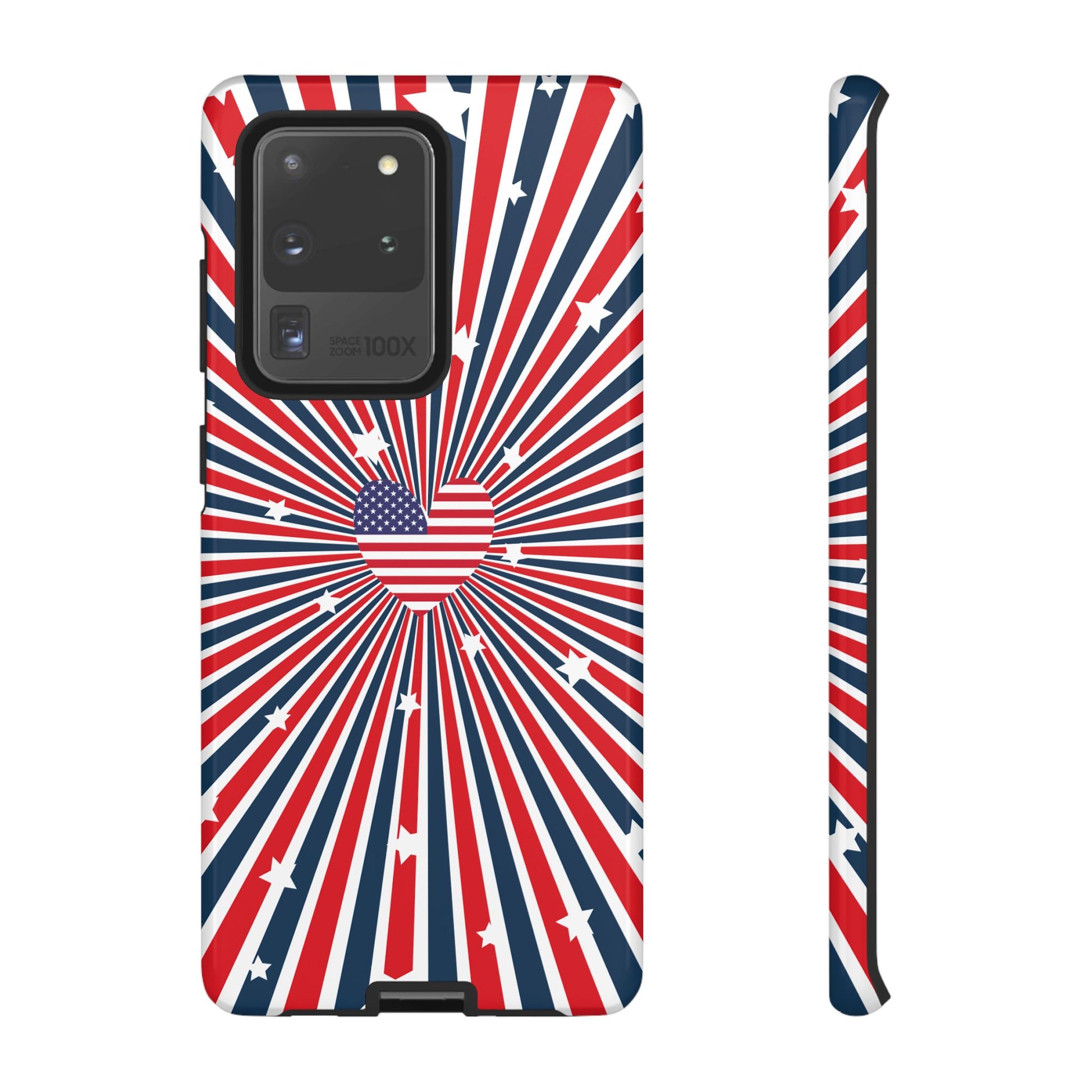 Patriotic Tough Phone Case perfect for 4th of July, Memorial Day, and Independence Day celebrations. Made with Lexan plastic and a flexible rubber liner for ultimate protection. Features a glossy finish and UV protection for long-lasting durability. Ideal for those who want to show their American pride while keeping their phone safe.