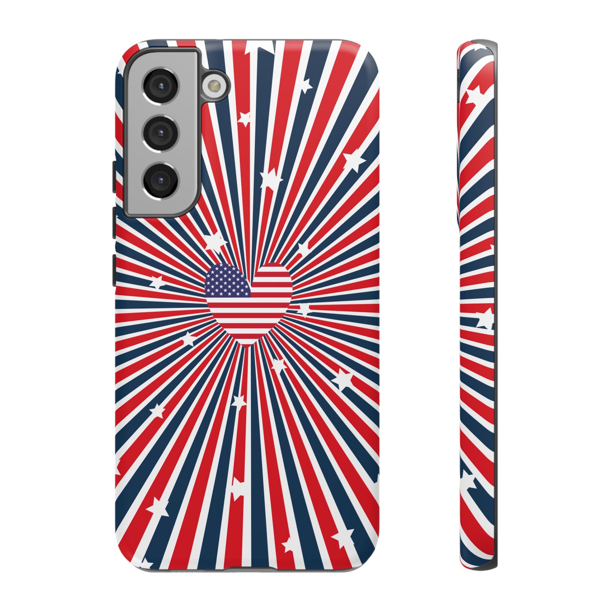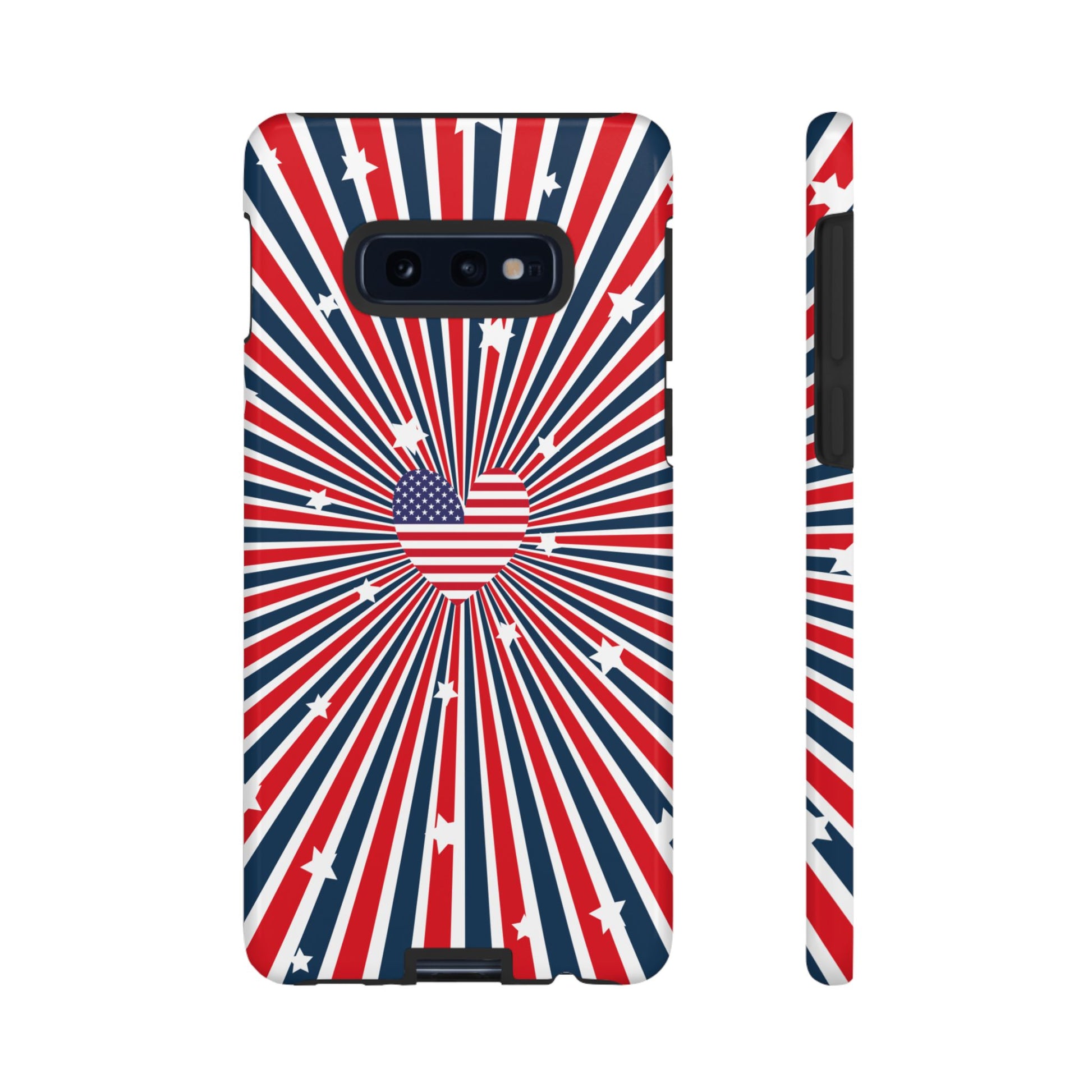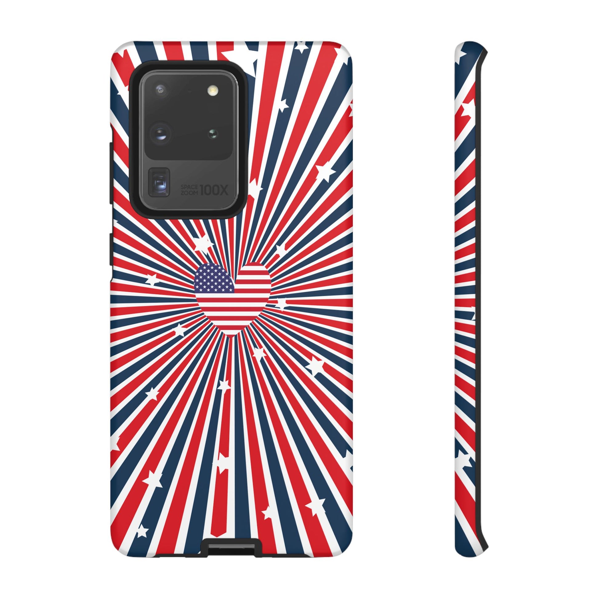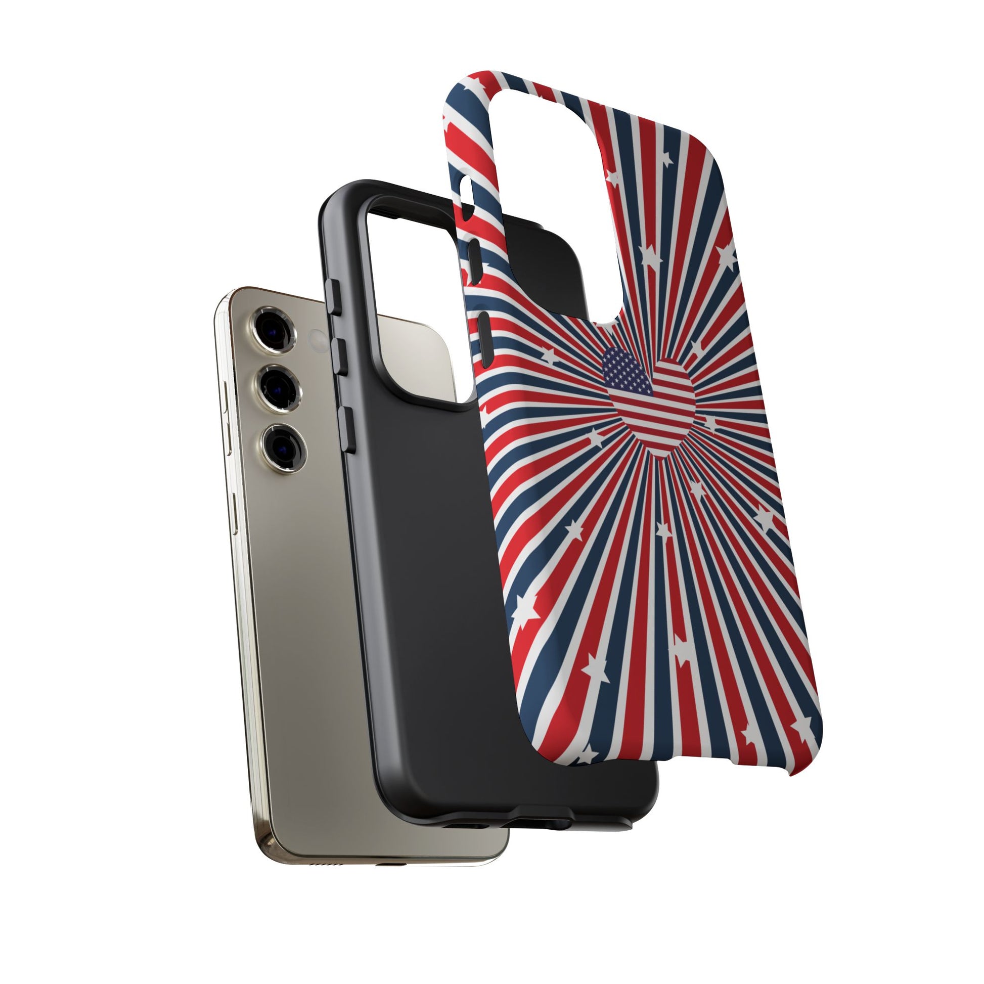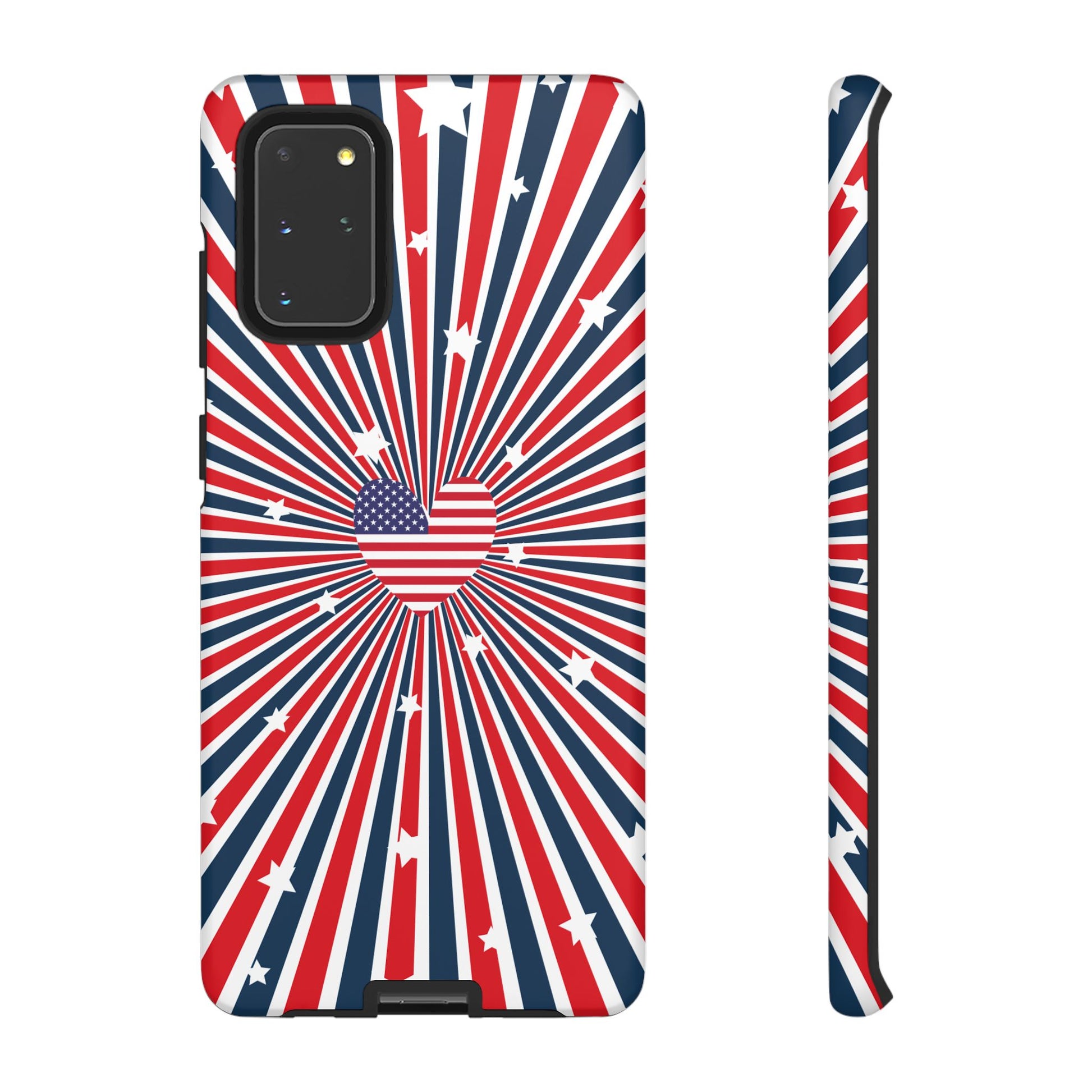 Patriotic Tough Phone Case perfect for 4th of July, Memorial Day, and Independence Day celebrations. Made with Lexan plastic and a flexible rubber liner for ultimate protection. Features a glossy finish and UV protection for long-lasting durability. Ideal for those who want to show their American pride while keeping their phone safe.