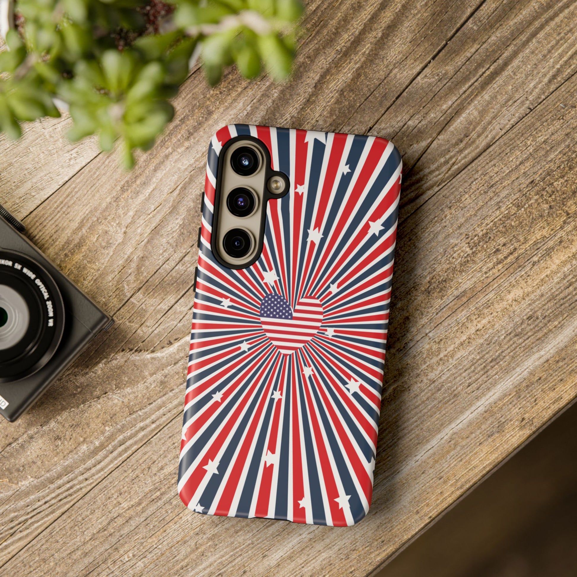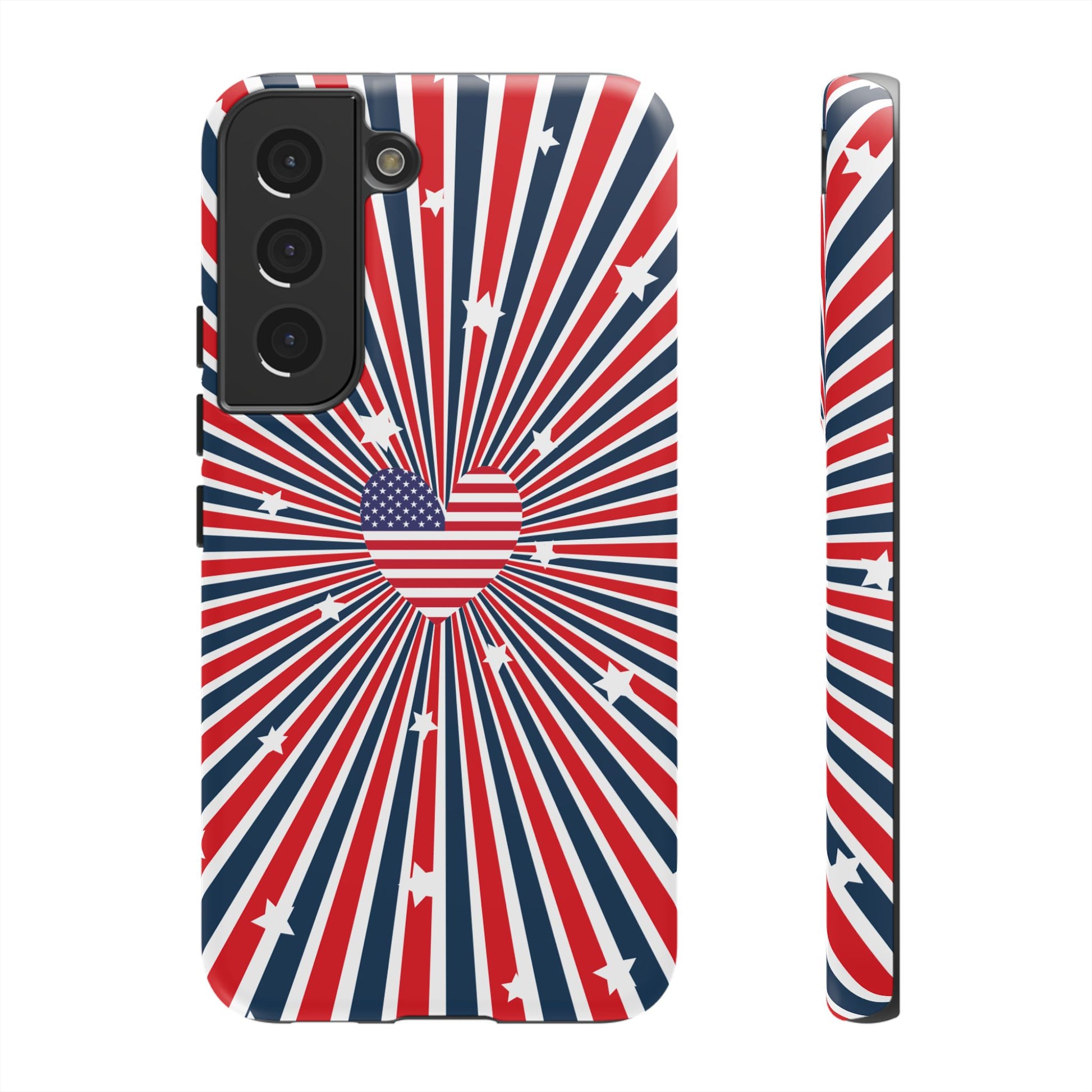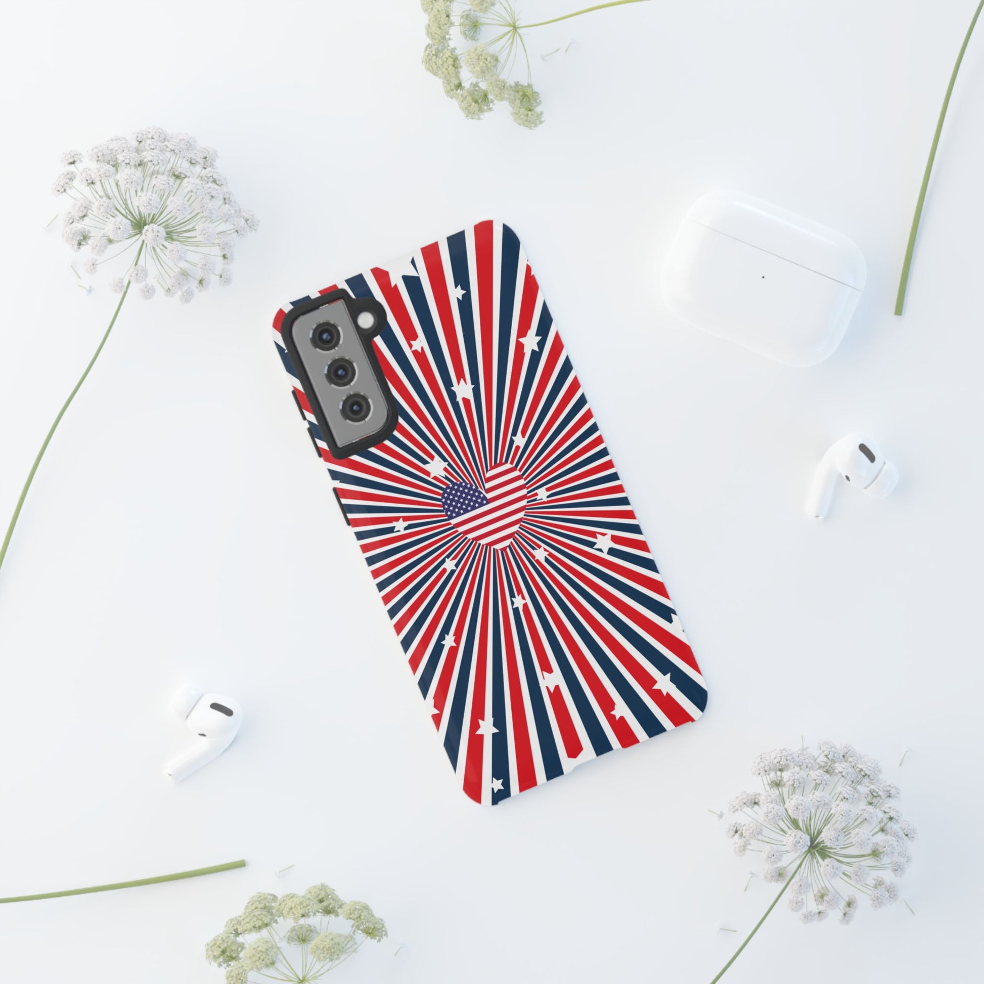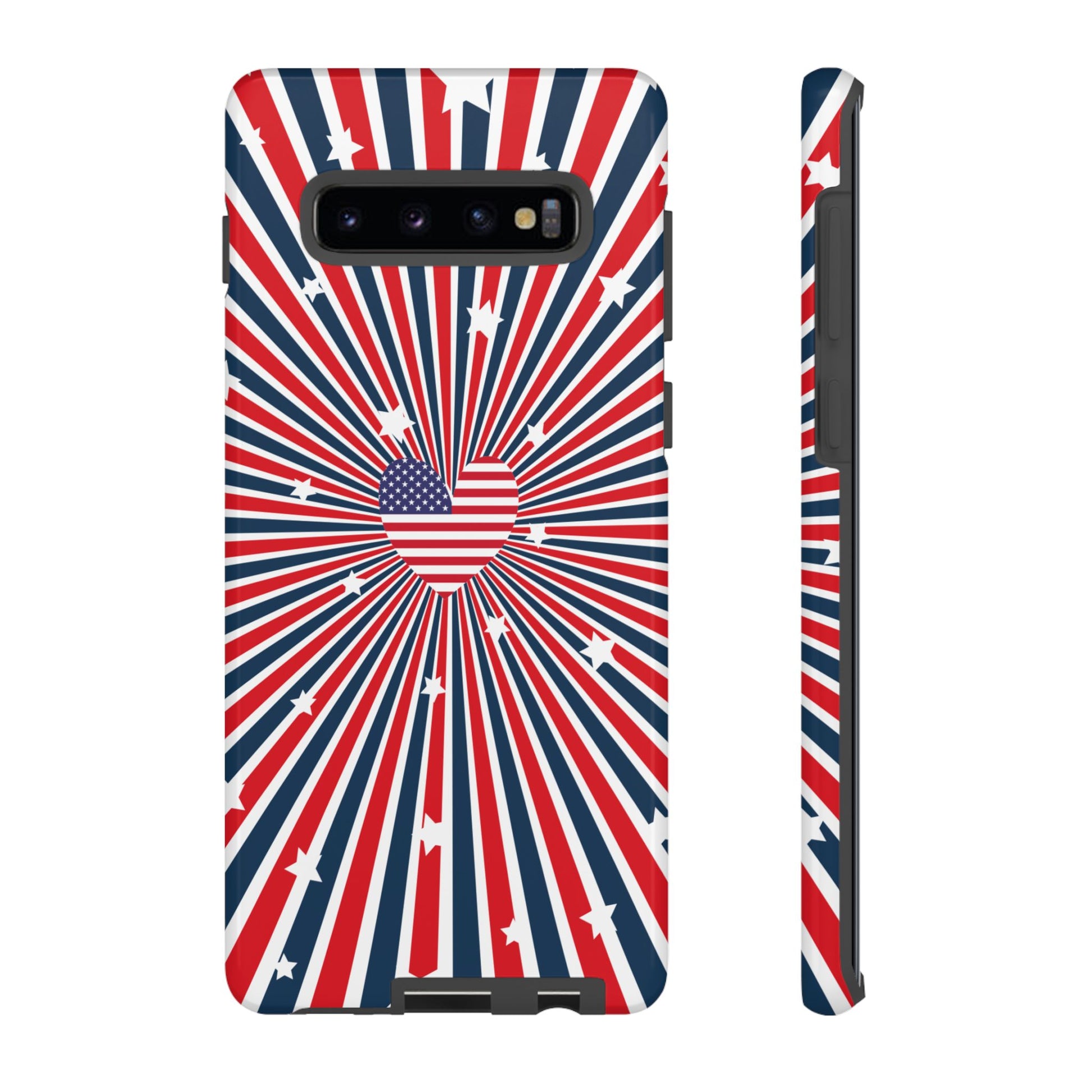 Patriotic Tough Phone Case perfect for 4th of July, Memorial Day, and Independence Day celebrations. Made with Lexan plastic and a flexible rubber liner for ultimate protection. Features a glossy finish and UV protection for long-lasting durability. Ideal for those who want to show their American pride while keeping their phone safe.