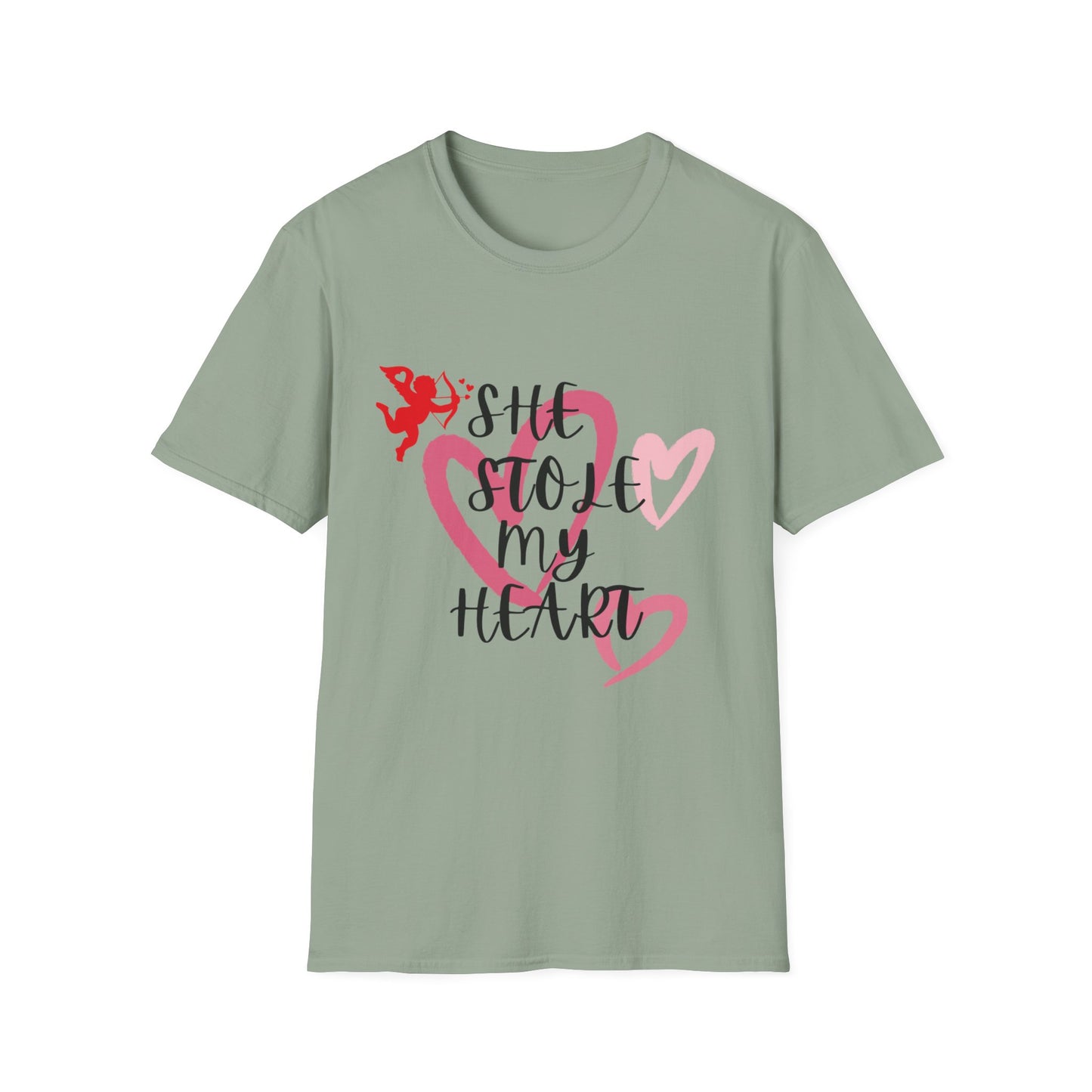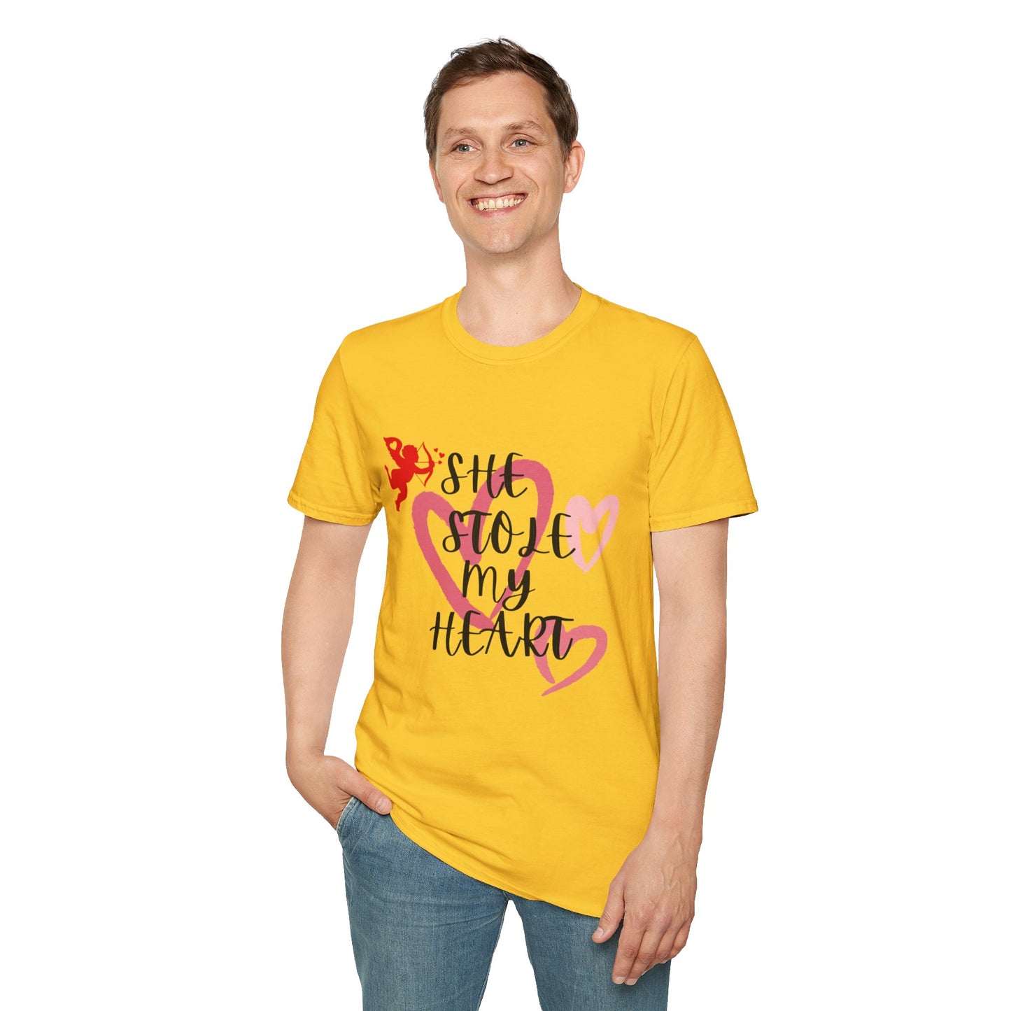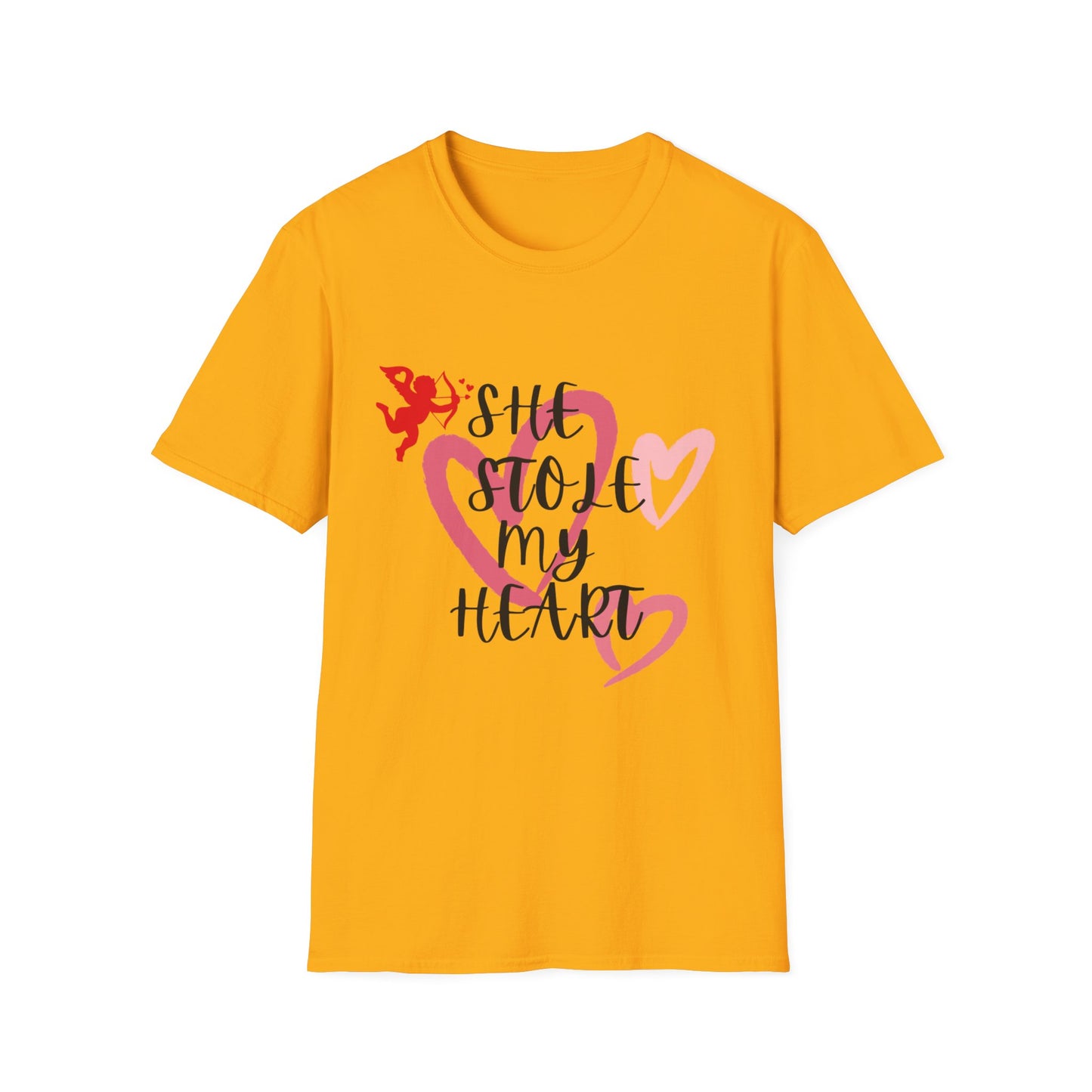 SHe Stole My Heart T-Shirt - Cute Valentine’s Day Couple Shirt. This unisex softstyle T-shirt is made from 100% ring-spun cotton, offering a lightweight and comfortable fabric. The classic fit and crew neckline make it versatile for any occasion, whether formal or semi-formal. Perfect for adults looking for a cute Valentine's Day outfit.